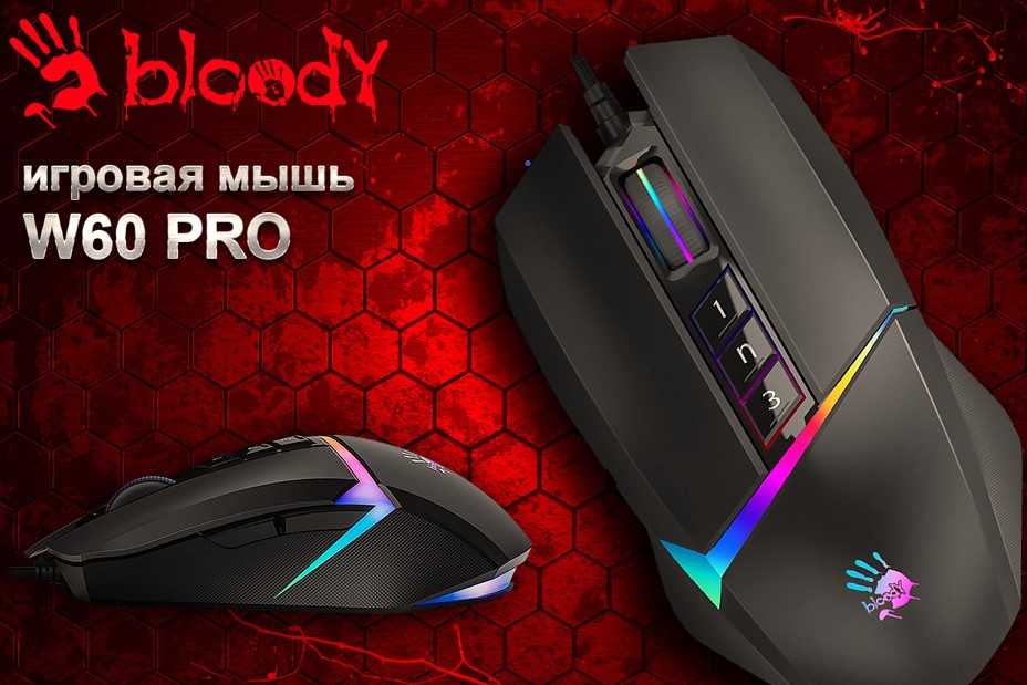 Мышь A4Tech Bloody W60 Pro Новый манипулятор Мышь A4Tech Bloody W60 Pro, цвет черный, оптическая (16000dpi), USB, представленная брендом Bloody позиционируется как игровая мышь, однако она превосходно подходит для профессиональных админов и дизайнеров работающих с графическими программами. Новый манипулятор исключительно чувствительный и точный, т.к. имеет улучшенный оптический сенсор PixArt 3389 с разрешением 16000 dpi, клавиши отзываются четким кликом, а колесико обрамлено накладкой, повышающей точность при нажатии и прокрутке, исключая фантомные или неточные клики, что безусловно оценят и профессионалы-айтишники. Что касается геймеров, то манипулятор содержит массу возможностей для настройки под разные типы игр, под индивидуальную манеру и игровые особенности самого геймера, позволяя держать контроль над процессом во время самых ожесточенных баталий.