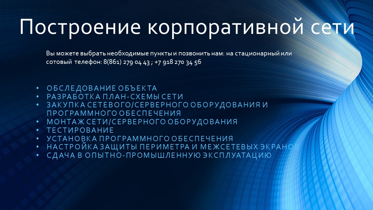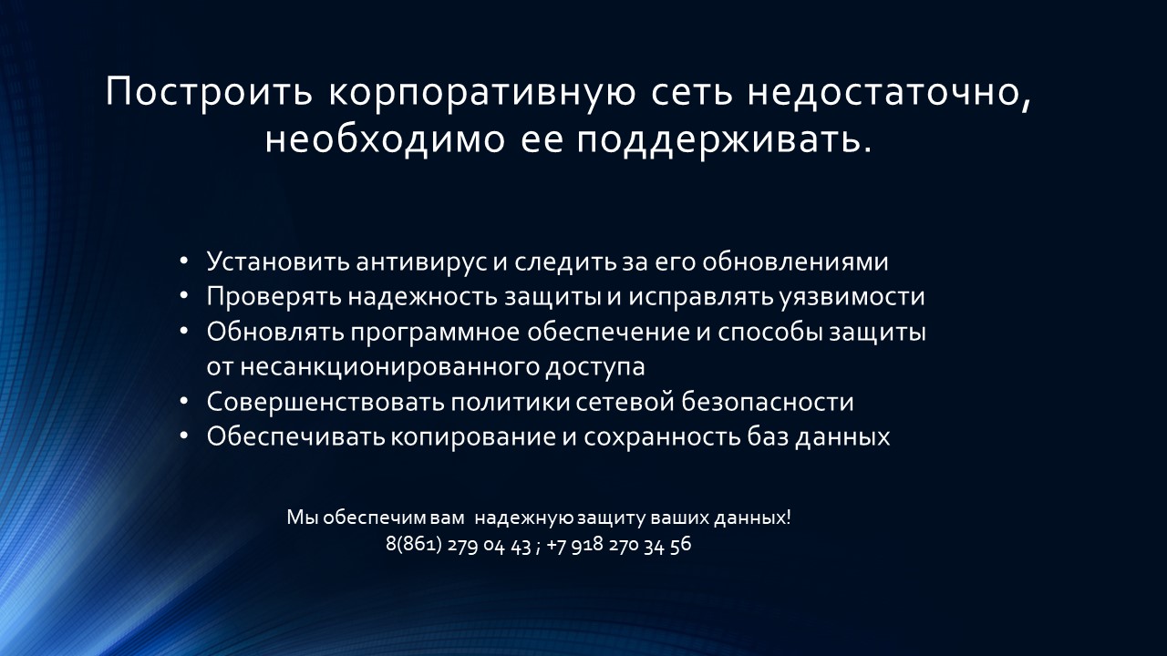 Мы готовы реализовать проект монтажа корпоративной сети любой сложности, с гарантией на все поставленное оборудование и на проведенные работы, с закреплением этих гарантий в договоре.
